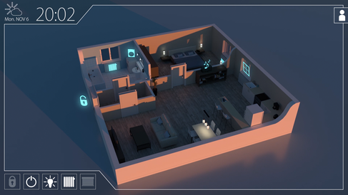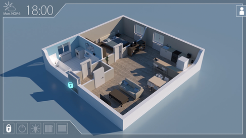 Für unseren Vorschlag in 3D ließen wir uns von sogenannten isometrischen Modellen inspirieren. Basierend auf dem gebrieften Grundriss bauten wir die Wohnung inklusive der Einrichtung in Cinema 4D. Wie bei isometrischen Modellen verzichteten wir auf die Decke und einen Teil der Wände, die der Kamera die Sicht versperren würden. Bei den Texturen achteten wir darauf, mit einer Mischung aus realen Materialien und simplen Farben, einen minimalistischen und modernen Look zu kreieren, der das Thema widerspiegeln sollte. Die Icons wurden hier ebenfalls im Grundriss platziert, mit dem zusätzlichen Vorteil, dass wir hier auch in der Höhe nicht eingeschränkt waren. Zu Beginn gab es für diese Version ebenfalls ein ähnlich detailliertes Interface, jedoch lenkte dies stark von der eigentlichen Animation ab. Wir entschlossen uns daher für eine minimalistische Anzeige, um die Uhr- und Tageszeit einbinden zu können und den Bezug zur 2D-Version zu behalten, ohne zu sehr vom Bild abzulenken. Zusätzlich versuchten wir die Icons im Bild so weit es geht zu reduzieren. Beispielsweise werden keine Icons für das Licht angezeigt, stattdessen wird dieses tatsächlich ein- und ausgeschaltet. Das Highlight der 3D Animation ist aber der Sonnenverlauf. Passend zur angezeigten Uhrzeit, geht in der Animation die Sonne auf und unter, wodurch nicht nur der beschriebene Tagesablauf unterstrichen wird sondern auch schöne Lichtverhältnisse entstehen.
